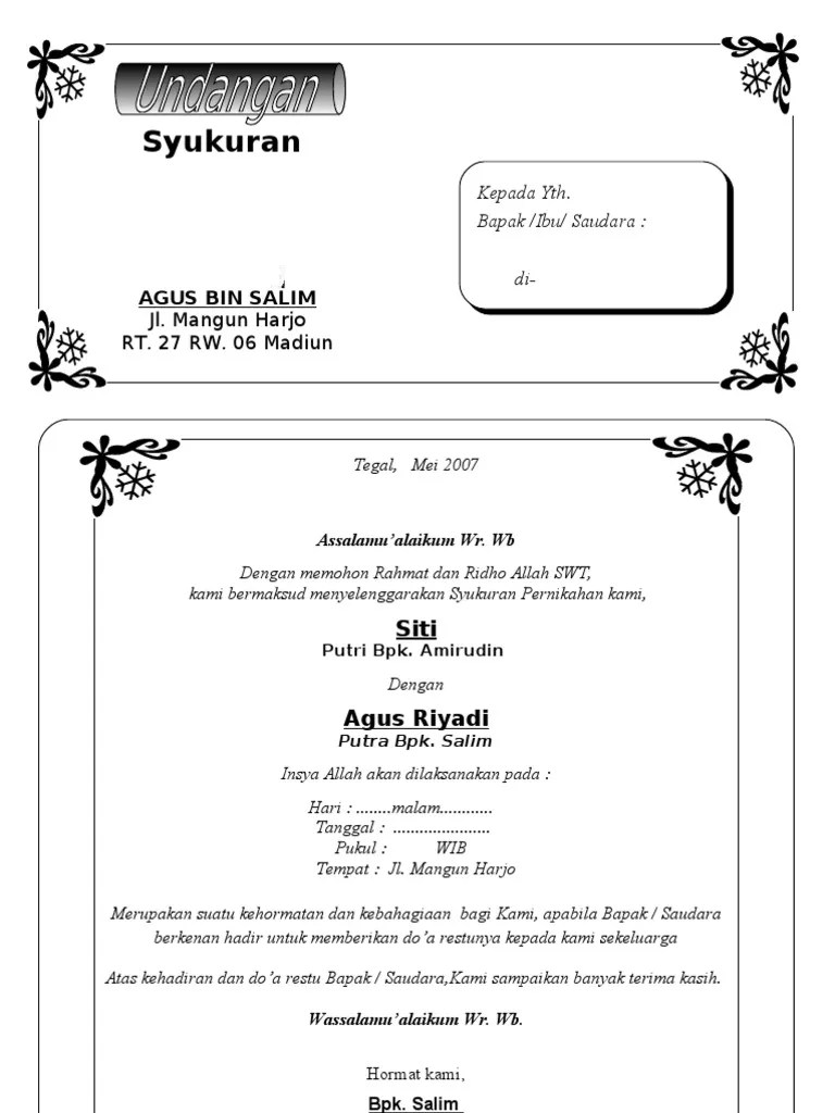 Contoh surat undangan syukuran pernikahan atau resepsi resmi. Contoh ucapan tasyakuran pernikahan di nasi kotak, cara membuat ucapan tasyakuran pernikahan, download contoh ucapan syukuran pernikahan . Senin, 30 agustus 2021 06:10. Ide ucapan tasyakuran pernikahan cdr merangkai kata. Contoh ucapan tasyakuran pernikahan nasi box.